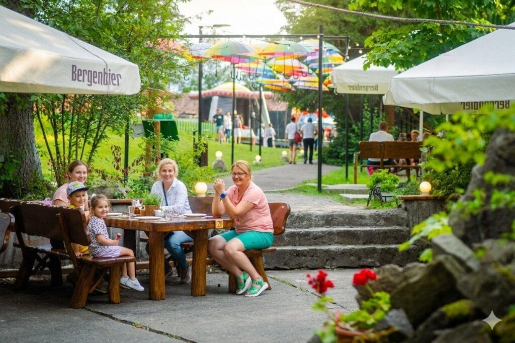 După aventură, relaxarea. O terasă în aer liber, la umbra copacilor, cu preparate tradiționale gătite cu drag după rețete locale. Mâncare simplă, caldă, pe placul tuturor. Nu rata Căsuța Dulciurilor — un colț magic unde pofta de dulce întâlnește măiestria cofetarilor, cu tarte artizanale și delicii care completează perfect atmosfera de poveste.
